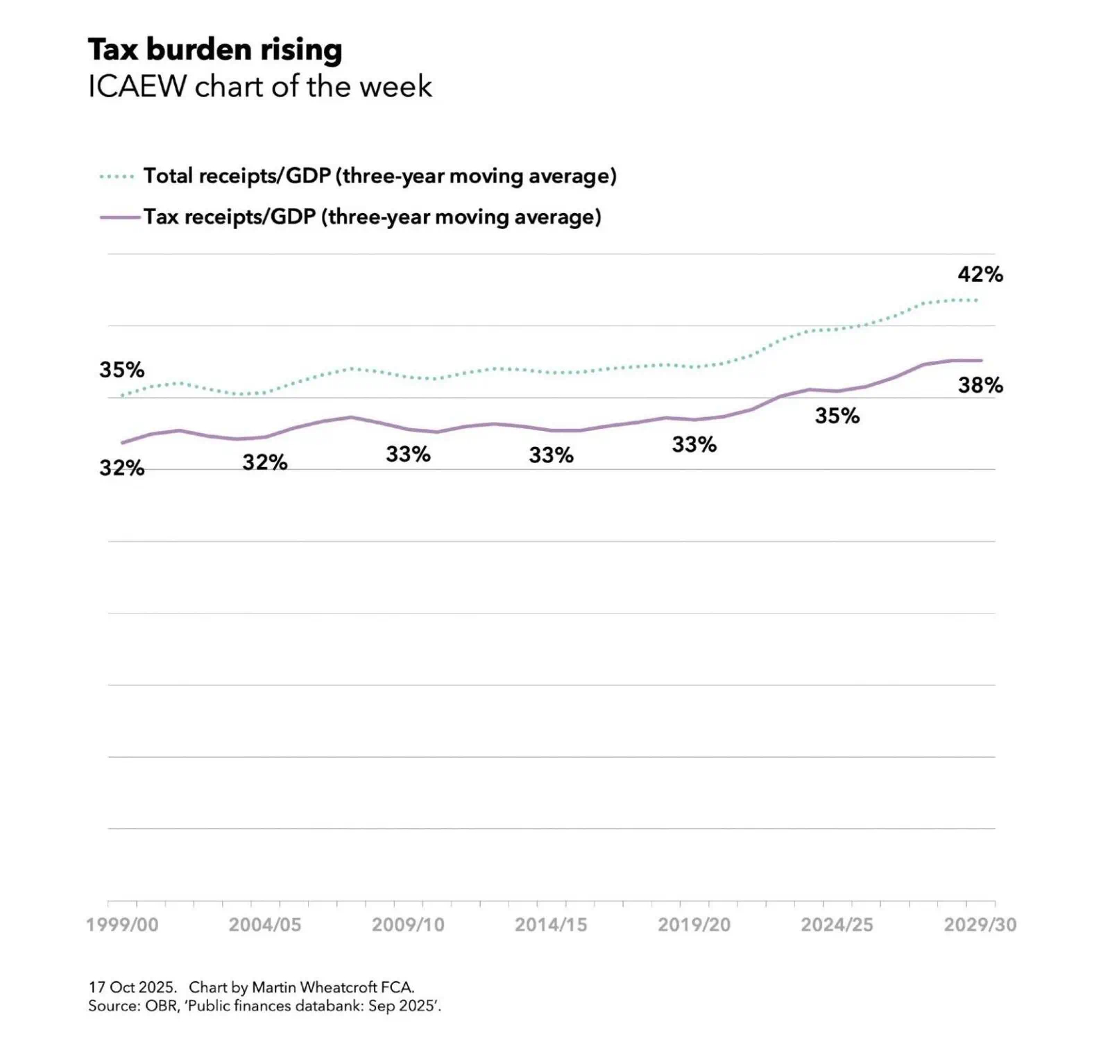 My chart of the week for ICAEW illustrates how tax receipts as a percentage of GDP averaged 32% over the three years to 1999/00, 32% to 2004/05, 33% to 2009/10, 33% to 2014/15, 33% to 2019/20, 35% to 2024/25 and are projected to hit 38% over the three years to 2029/30, based on data from the Office for Budget Responsibilities’ public finances databank for September 2025.