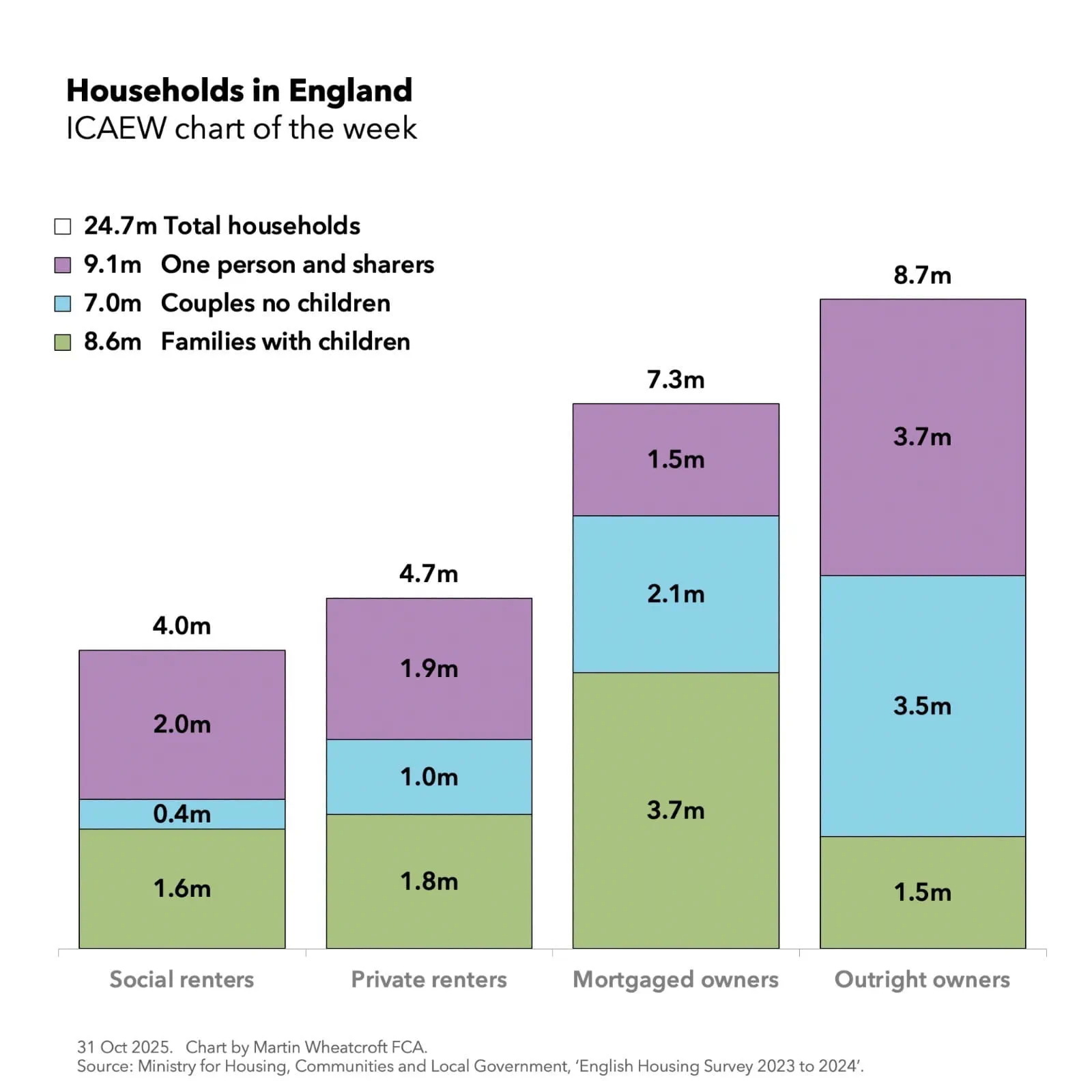 My chart for ICAEW this week illustrates that there were 24.7m households in England in 2023/24 according to the Ministry of Housing, Communities and Local Government. Of these, 4.0m, or 16% of households, were in social housing (2.5m housing association and 1.5m local authority properties), 4.7m, or 19%, were tenants of private sector landlords, 7.3m, or 30%, were in properties owned with a mortgage, and 8.7m or 35% were in properties owned outright.
